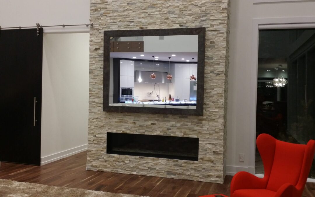 Yet another creative use for the Mirrorlite® Glassless Mirror where heavy glass mirror would be impractical. A special scrim(two-way) reflective surface is utilized allowing the TV screen to illuminate when turned on. When the TV screen is turned off it appears as a normal mirror.