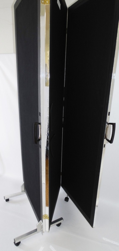 The folding, free-standing design eliminates the need for separate support stands and allows the mirror to be compactly stored or moved between locations. Mirrors come pre-installed with rubber feet for stability and include integrated carrying handles with a Velcro® latch for secure transport. No assembly is required.