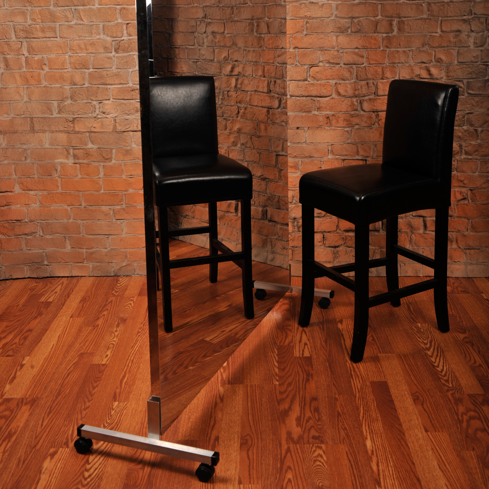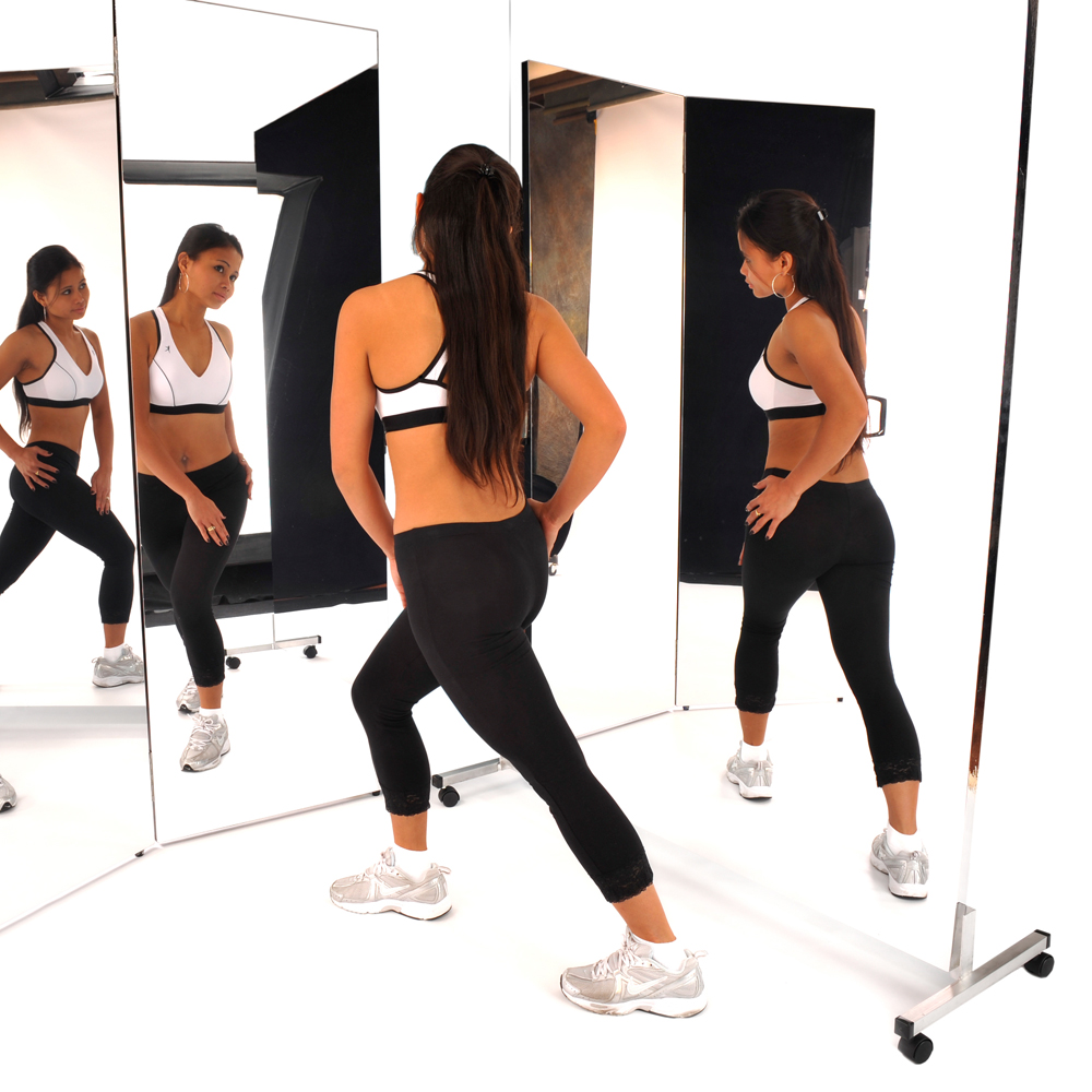 This free-standing glassless mirror features a rigid reflective surface supported by durable aluminum floor stands with protective plastic end caps. The lightweight construction allows the mirror to be easily repositioned or rolled into storage when not in use, making it ideal for studios and multi-use spaces.