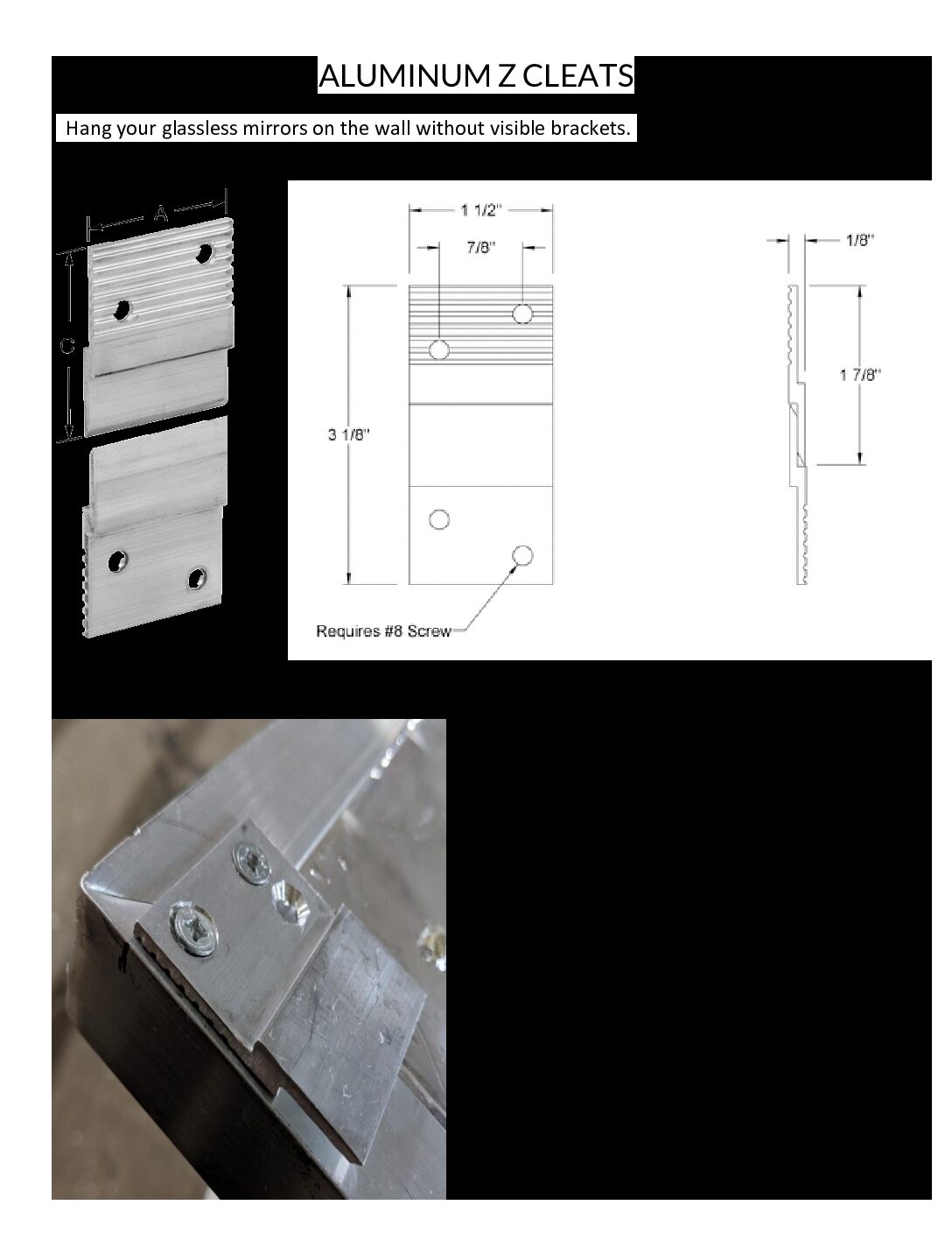 Hang your Mirrorlite mirrors on the wall without visible brackets. Mount a pair on the wall and a pair on the mirror and slide the mirror down the wall until the cleats engage. Tack the bottom in place with dual lock or an “L” bracket.